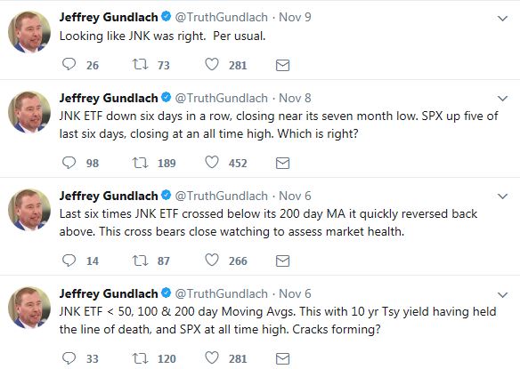 It could be said that market breadth is an imperfect timing tool. Negative divergence can exist for months before the major averages drop. The credit markets is another matter. Jeff Gundlach issued a series of warnings based on the action of the junk bond market.