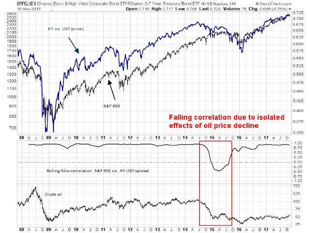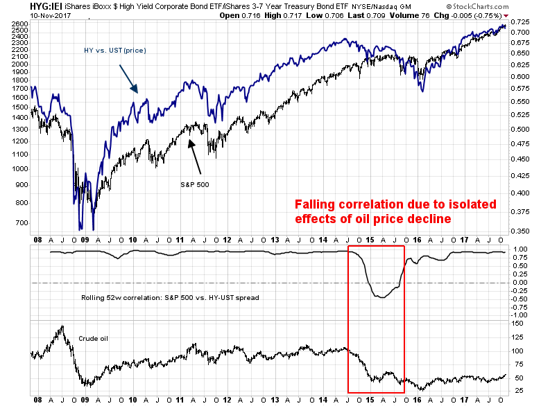 Indeed, the approach of using HY to measure risk appetite can be useful as a confirmation signal. The chart below shows the history of equities and the relative performance of HY to UST. With the exception of a brief episode in late 2014 when energy related HY dragged down the performance of the sector, the two series have been highly correlated in the last 10 years.