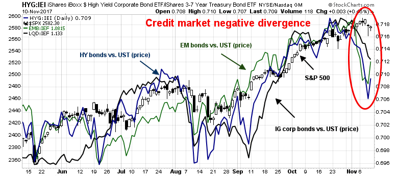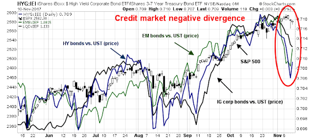 While Gundlach highlighted the negative price action of junk bond, or high yield (HY), ETFs, I prefer to focus on the relative price action of HY bonds to equivalent duration Treasury paper, which neutralizes the interest rate effect to analyzes the credit spread effect (see The market`s report card on the GOP tax bill).. As the chart below shows, credit spreads were not only rising in the HY market, but investment grade corporates and EM bonds too. Even though HY and EM bonds recovered a bit on Friday, IG relative performance continued to deteriorate, indicating that further stress is likely ahead.