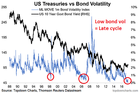 The lack of volatility is not just restricted to the VIX Index, which measures equity volatility. Callum Thomas at Topdown Charts pointed out that low bond volatility is also a characteristic of a late cycle expansion. A rise in the MOVE Index could also be a signal that the market could be topping (annotations in red are mine).