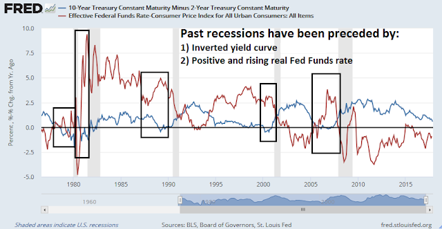 Even though the yield curve is flattening, past recessionary episodes have been preceded by a positive and rapidly rising real Fed Funds rate.