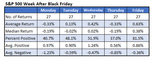 Schaeffer’s Research also found that the week after Thanksgiving has historically shown a minor bearish bias, at least until Friday.