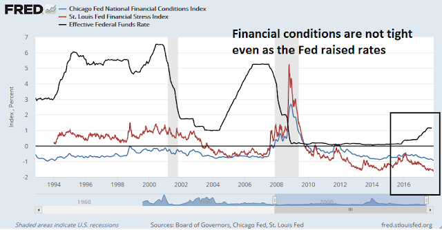 Are financial conditions tightening? Financial condition indices are currently signaling loose conditions. Equities are unlikely to get overly stress until financial and liquidity conditions tighten as the Fed raises rates.