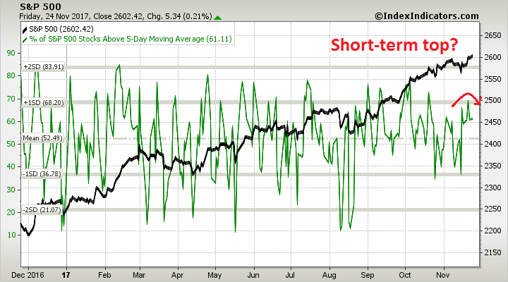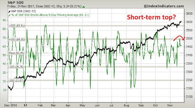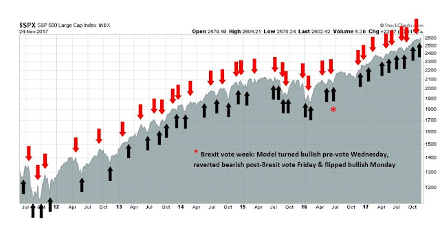 Looking to the week ahead, the outlook appears to be mixed. Subscribers received an email alert that my trading account had taken profits on all of its long positions and moved to 100% cash because of the event risk posed by the upcoming vote next Thursday on the GOP tax bill. The market was not overbought, but the lack of bullish follow through was disturbing for the bulls, and these readings could be indicative of a short-term top.