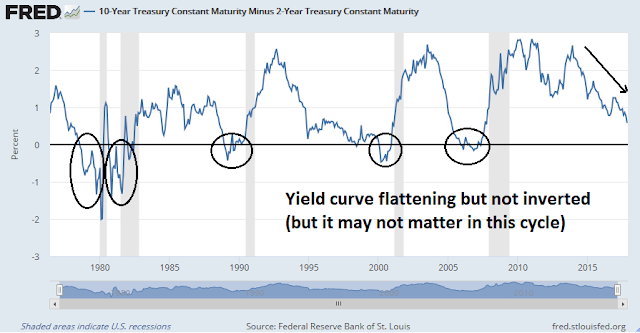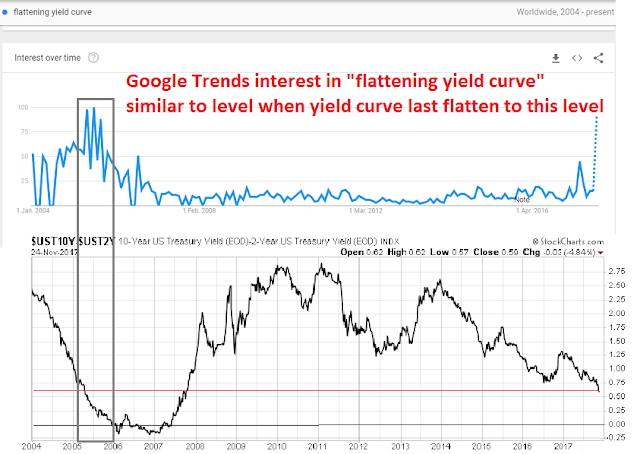 I received a considerable amounts of feedback to my post last week (see 2018 outlook: Last charge of the bulls) over my comments about the risks posed by a flattening yield curve. Interest in the term “flattening yield curve” has spiked, but consistent with levels last seen when the yield curve flattened to this level.