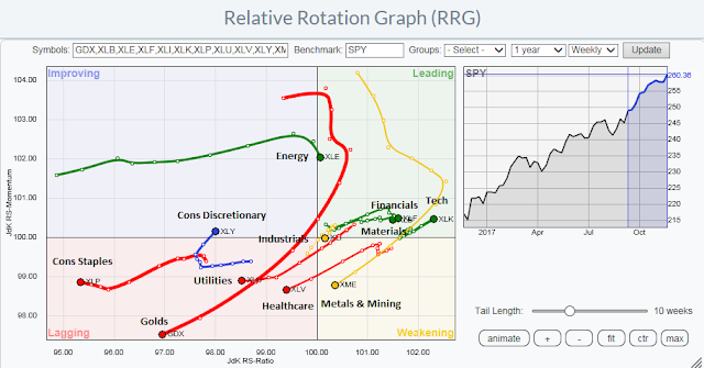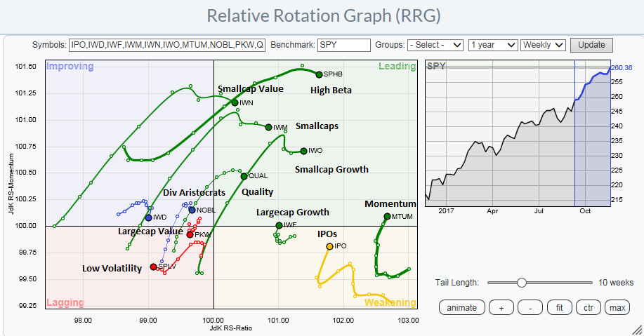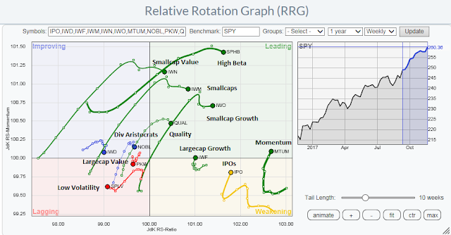 The market has been dominated by a risk-on bias. The Relative Rotation Graph (RRG) chart by style shows that leadership has been shown by high beta stocks, such as small caps, growth, and momentum stocks.