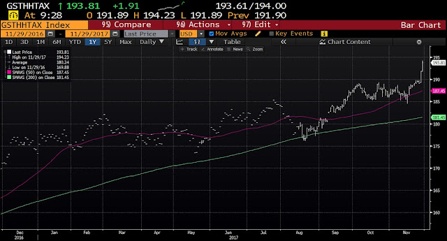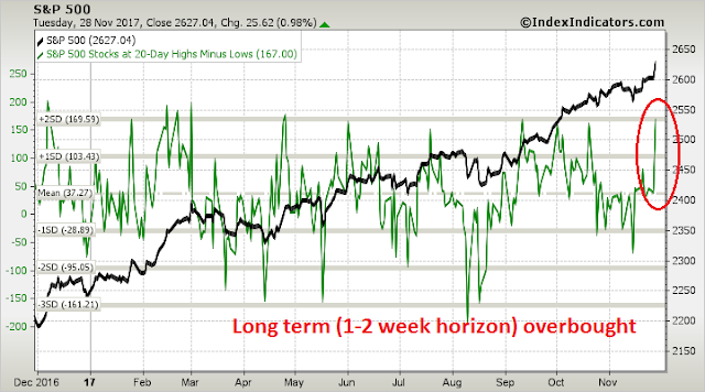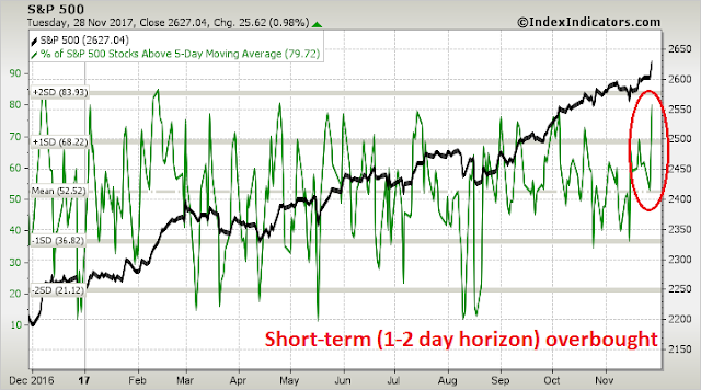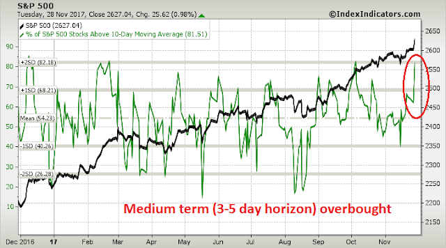 Notwithstanding the hurdles surrounding the passage of the Senate tax bill, Urban Carmel highlighted some short-term risks to the market after the strong market action on Tuesday: