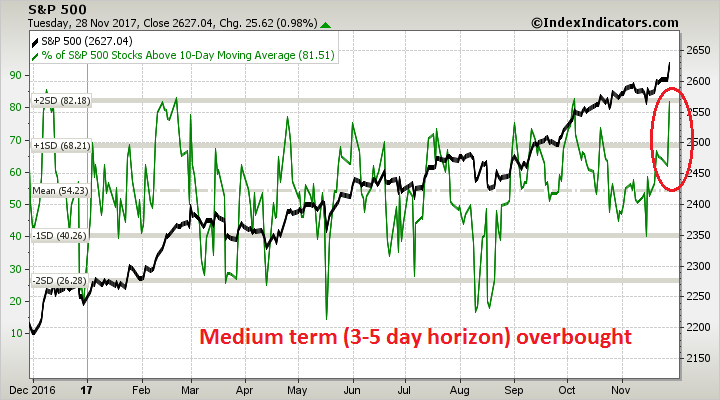 Notwithstanding the hurdles surrounding the passage of the Senate tax bill, Urban Carmel highlighted some short-term risks to the market after the strong market action on Tuesday: