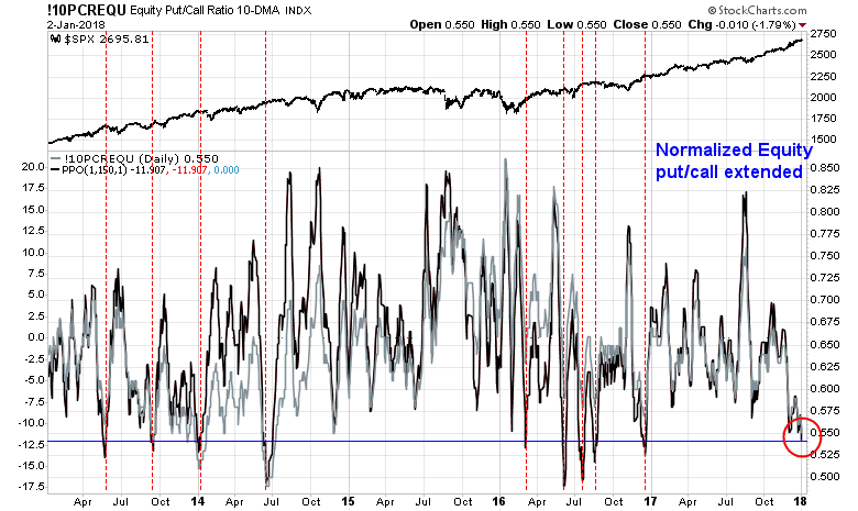 Normalized CPCE is showing a similar level of complacency. Even though these readings do not guarantee a correction, past episodes has seen the market struggle to advance.