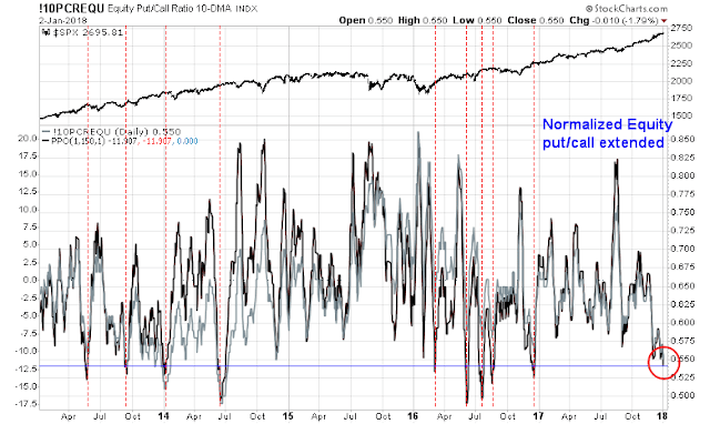 In the short run, sentiment is getting frothy. The CBOE equity put/call ratio (CPCE) closed at an astoundingly low 0.47 reading yesterday. As of this writing, the interim estimate is 0.75. In the last 10 years, CPCE has fallen below 0.50 only four times. Past returns have been mixed, as the market weakened shortly after these readings in two instances, and continued to advance in two others, though the cases where the market rose were clustered together.
