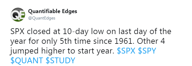 Mid-week market update: The stock market began the year by roaring out of the gate. This was not a big surprise. Rob Hanna at Quantifiable Edges tweeted on New Year’s Eve that the market has rallied strongly when it closed at a 10-day low at the end of the year.