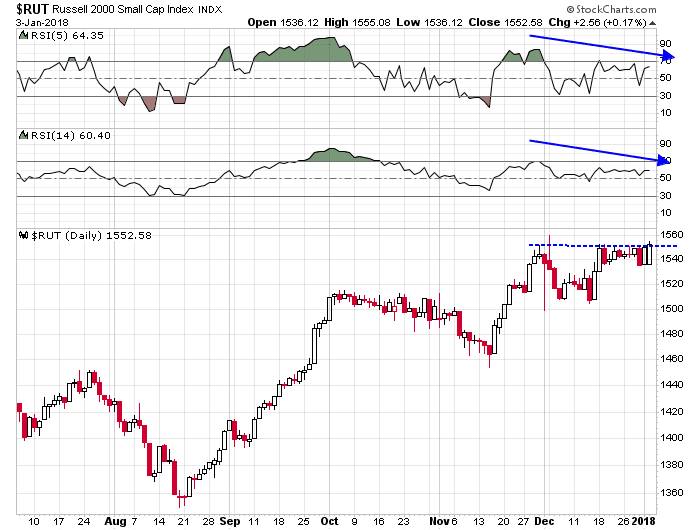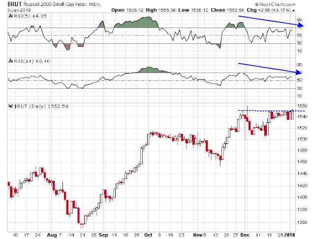 Another disturbing signs for the bulls is the appearance of negative divergences in both 5 and 14 day RSI as the market rallies to fresh highs.