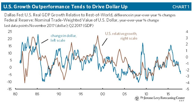 On the other hand, how would it react should inflationary pressures strengthen even as trade tensions rise? The historical evidence indicates that USD strength is correlated with differences in economic growth. Supposing that multi-nationals respond to tariffs by shifting production to other countries not affected by trade sanctions, such a development would lower the relative US growth potential against other countries, and therefore put downward pressure on the greenback.