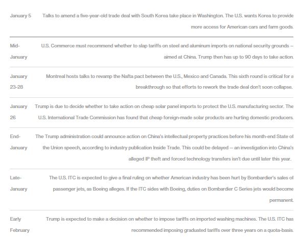 Trump is due by the end of January to render his first decision in response to petitions from U.S. companies seeking tariffs or import quotas on Chinese solar panels and washing machines manufactured in China and its neighbors.
