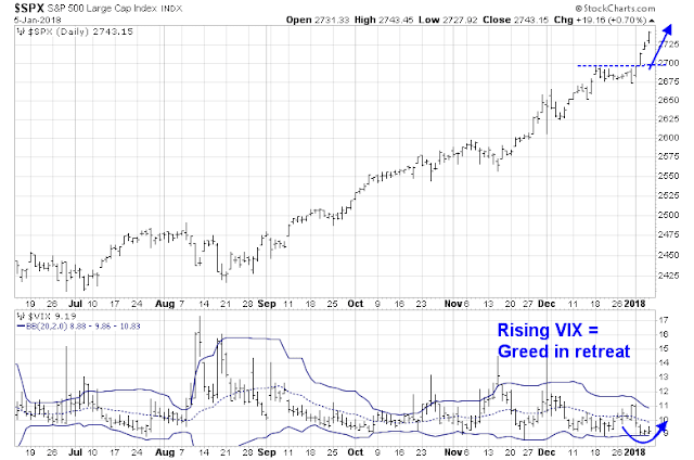 What about the signs of excessively bullish sentiment outlined in my last post (see A frothy rally, but…)? It appears that some of the signs of over the top greed is in retreat. The VIX Index, which usually moves inversely to the market, rose for the last two days, even as the market ground upwards to fresh highs.
