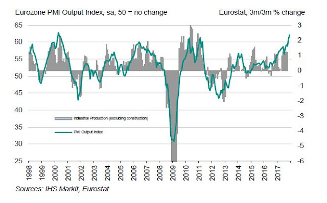 The latest report shows that eurozone manufacturing PMI ending 2017 at record highs, with all-time highs seen in Germany, Austria, and Ireland. Will Europe outperform the US should a trade war erupt? How this question of relative growth rates resolves itself will matter the the direction of the USD, inflation, and Fed policy.
