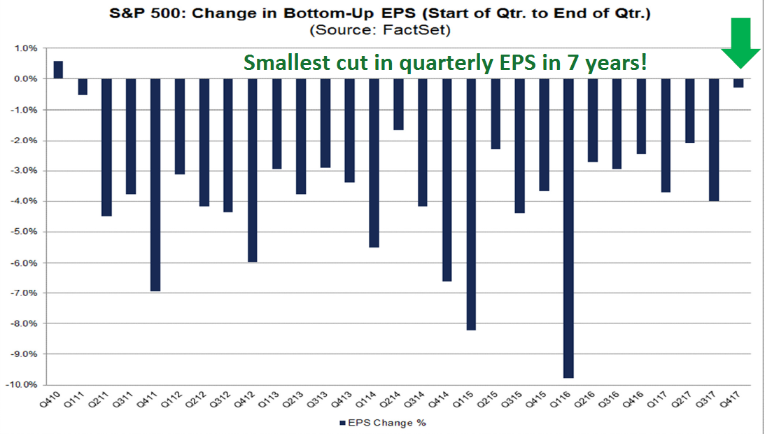 Looking ahead to the upcoming Q4 2017 earning season, earnings expectations are upbeat. Company analysts have had a historical tendency to be overly optimistic in their earnings estimates, and then revise down slowly as time progresses. Butters observed that we are seeing the smallest cut in quarterly EPS estimates in seven years.