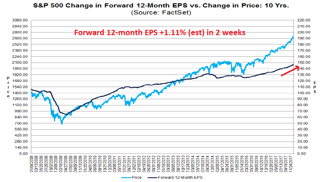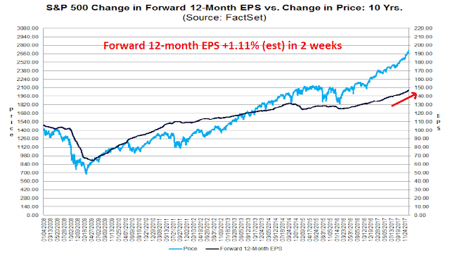It does not appear that the optimism in Q4 earnings estimates is attributable to the recently passed tax cuts. The effects of any tax cut would not take effect until 2018. As well, analysts began revising Q4 estimates upwards in mid-November, which was a period when there was still a high degree of uncertainty over tax legislation. I therefore conclude that the optimism over Q4 2017 earnings is a cyclical effect due to the synchronized global rebound.