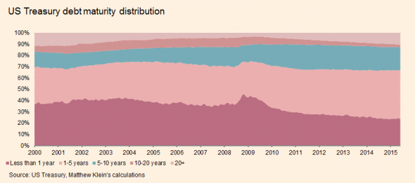 Another paradoxical reaction to the news is the steepening of the yield curve in response to the news. Matthew Klein at FT Alphaville pointed out the following anomaly. The chart below depicts the maturity profile of outstanding Treasury securities.