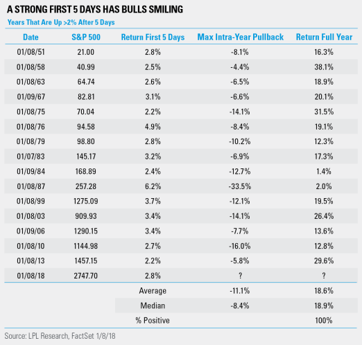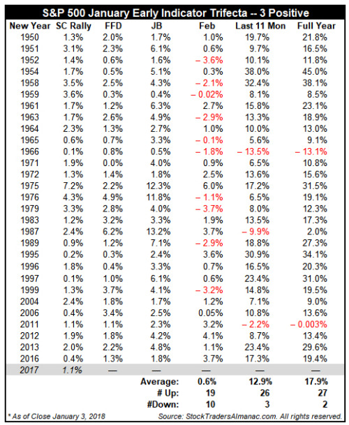 In addition, analysis from Jeff Hirsch of Almanac Trader showing a shorter positive momentum effects of the FFD for the remainder of January, shown as JB in the table below (January Barometer). Since 1950, whenever the first five days was positive, the rest of January went on to be positive 86% of the time, with an average return of 2.6% and median return of 2.1% for the remainder of the month (N=29).