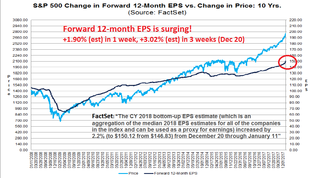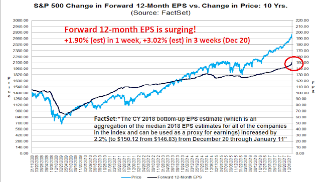 To quantify the tax cut effect, FactSet reported that forward EPS has risen an astonishing 1.90% in one week, and 3.02% since December. Moreover, 2018 estimates have risen 2.2% from December 20 to January 11. The increase in these bottom-up aggregates only began when the actual details of the tax bill became known, as company analysts would not raise their estimates until they could calculate the precise impact of the corporate tax cuts on the companies in their coverage universe.