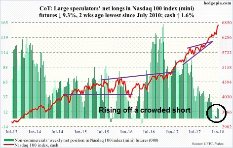The latest report from Hedgopia found that large speculators (read: hedge funds) are moving off a crowded short position in the NDX. This suggests that some people in the fast money crowd got caught offside as the market rose. Traders who got caught are likely feeling a lot of pain in this updraft, indicating that there is potential buying power as risk managers force hedge fund traders and portfolio managers to cover their short NDX positions.