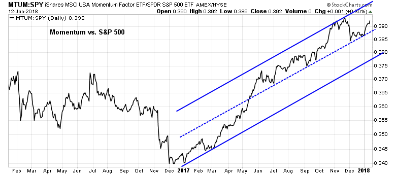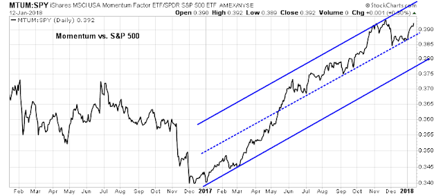 If momentum is a characteristic of bubbles and melt-ups, then the behavior of this factor indicates that the blow-off is not at an end. MTUM, which is the price momentum ETF, remains in a healthy relative uptrend to the market.