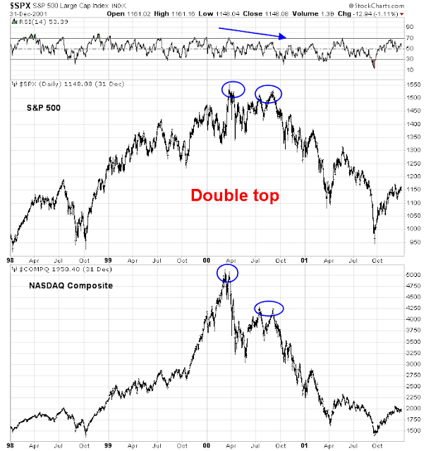 Another frenzied top occurred in 2000 when the NASDAQ staged an upside blow-off. While the double top was less discernible in the chart of the NASDAQ Composite, the pattern is far clearer in the SPX, which saw a negative RSI divergence as stock prices rallied after the initial top.