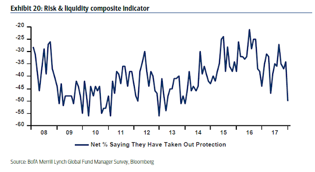The latest evidence from January 2018 BAML Fund Manager Survey (FMS) is mixed. On one hand, the latest results indicate that fund managers have thrown caution to the wind and discarded the tail-risk hedges in their portfolios, which can be interpreted as contrarian bearish.