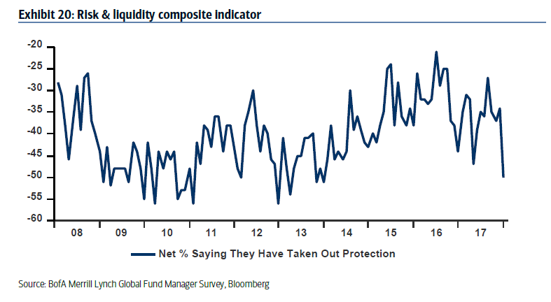 The latest evidence from January 2018 BAML Fund Manager Survey (FMS) is mixed. On one hand, the latest results indicate that fund managers have thrown caution to the wind and discarded the tail-risk hedges in their portfolios, which can be interpreted as contrarian bearish.