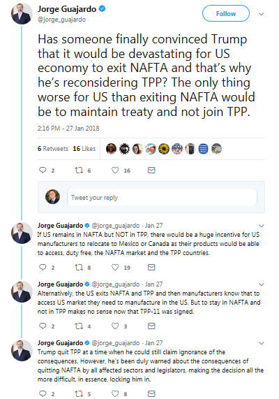 Another source of trade tension for the markets are the NAFTA negotiations. Jorge Guajardo, who was Mexico’s ambassador to China, had the following perspective on the NAFTA negotiations.