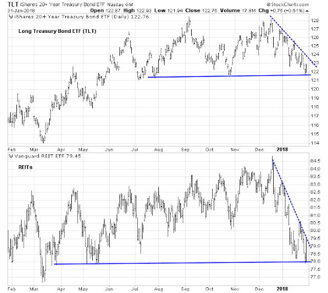 For some clarity, here are some clues to further market direction. I recently wrote about possible bottoms forming for interest sensitive vehicles and the USD (see The pain trade signals from the bond market). Since the publication of that post, selected interest rate sensitive ETFs have tested key support levels and bounced, though their downtrends remain intact.
