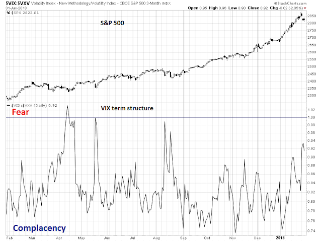 The bears can point out that the neither the absolute level of the VIX, nor changes in the VIX are very relevant to future stock market direction. A better way to measure fear is to normalize the VIX by observing its term structure. Inverted term structures, where short-term implied volatility is higher than long term volatility, are much better indications of real fear. As the chart below shows, the term structure has not inverted, which is a signal of a lack of fear.