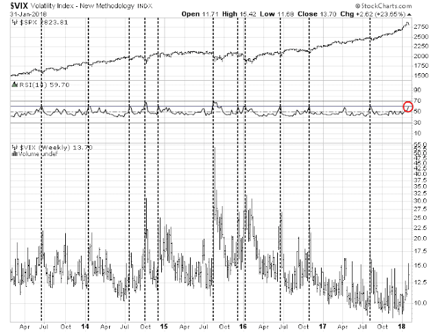 The bulls can point to the spike in the VIX as putting a floor on stock prices. If history is any guide, the weekly RSI levels indicate minimal downside risk for equities in the past (h/t Andrew Thrasher).