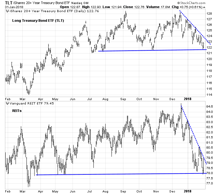 For some clarity, here are some clues to further market direction. I recently wrote about possible bottoms forming for interest sensitive vehicles and the USD (see The pain trade signals from the bond market). Since the publication of that post, selected interest rate sensitive ETFs have tested key support levels and bounced, though their downtrends remain intact.