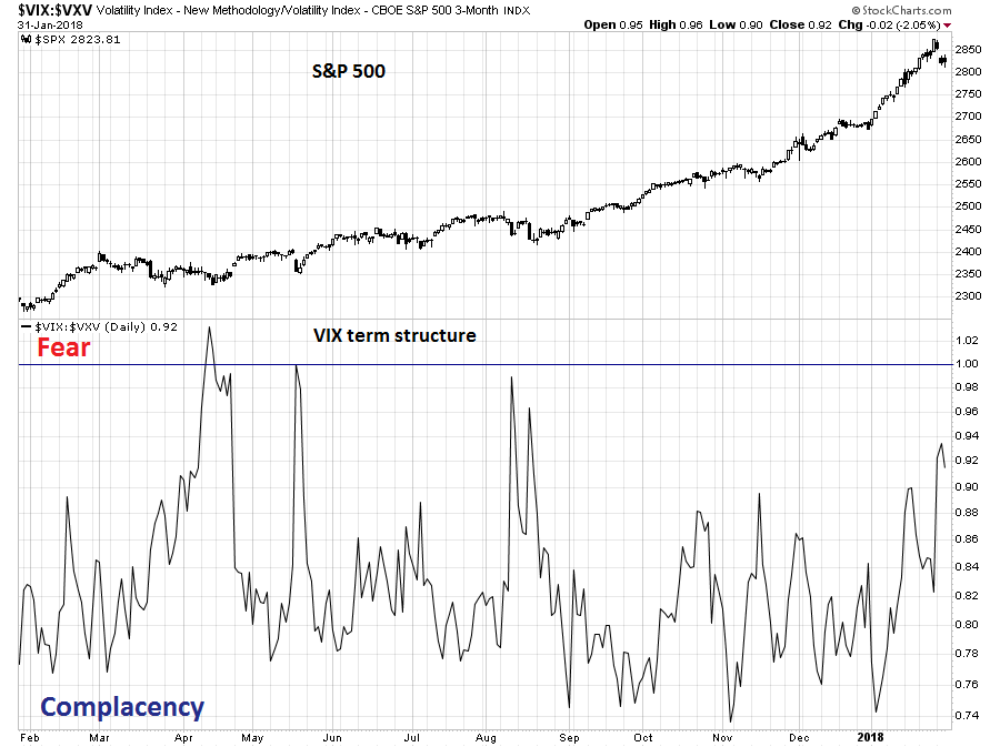 The bears can point out that the neither the absolute level of the VIX, nor changes in the VIX are very relevant to future stock market direction. A better way to measure fear is to normalize the VIX by observing its term structure. Inverted term structures, where short-term implied volatility is higher than long term volatility, are much better indications of real fear. As the chart below shows, the term structure has not inverted, which is a signal of a lack of fear.