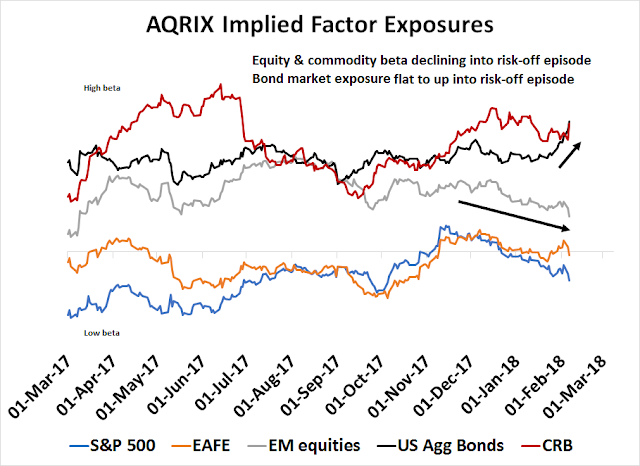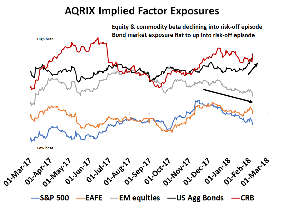 My heuristic analysis of factor exposures also revealed that the bond market factor exposure of AQRIX was flat to up in the weeks leading up to the latest risk-off episode, while the factor exposure to equities and commodities was sliding.