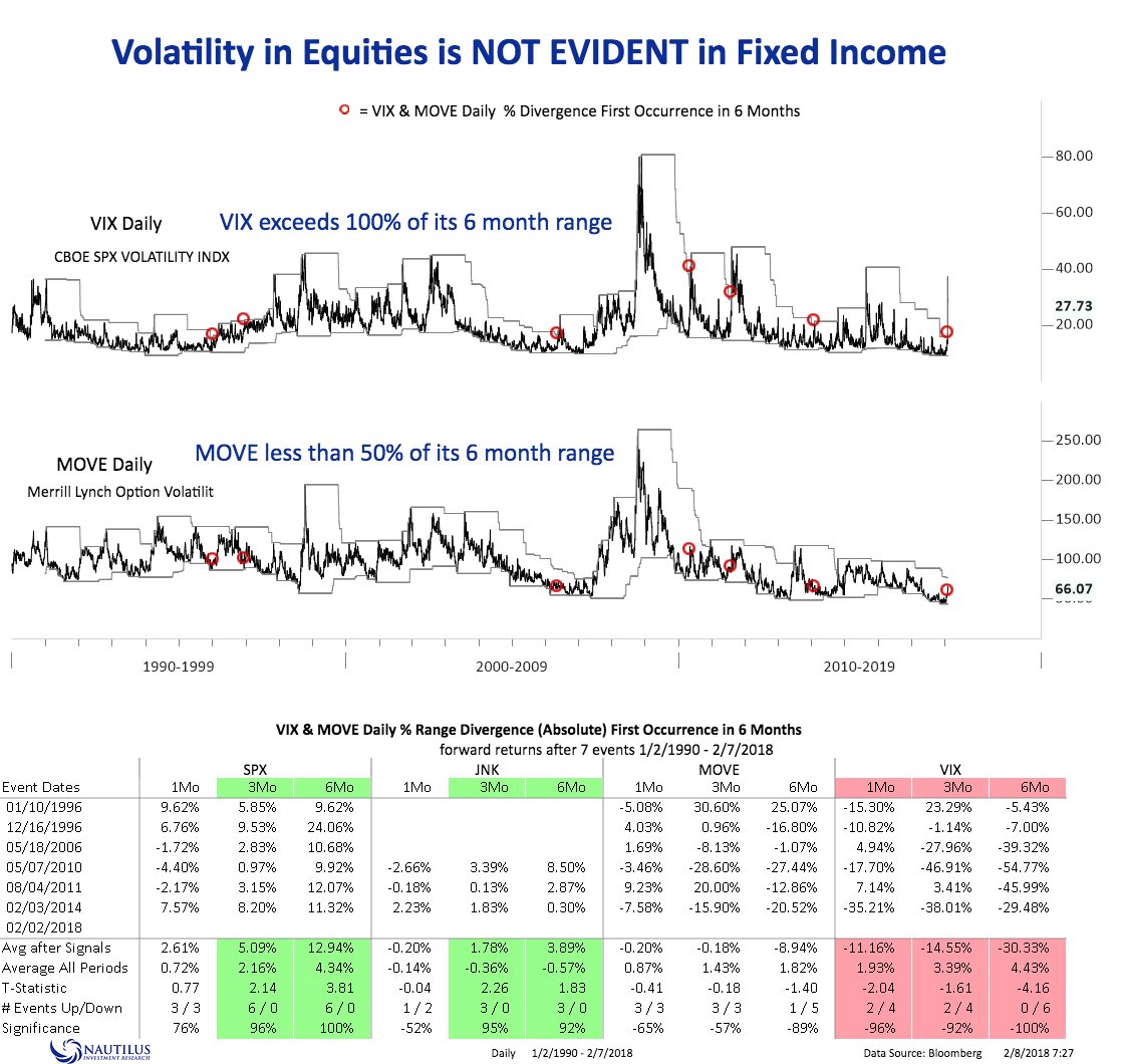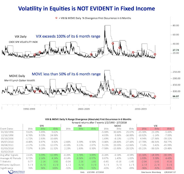 As a postscript, there is also a bullish equity market implication to this analysis. The spike in stock market volatility has not been matched by bond market volatility. A study by Nautilus Research found that these conditions have tended to be equity bullish, though the same size is small (N=6).