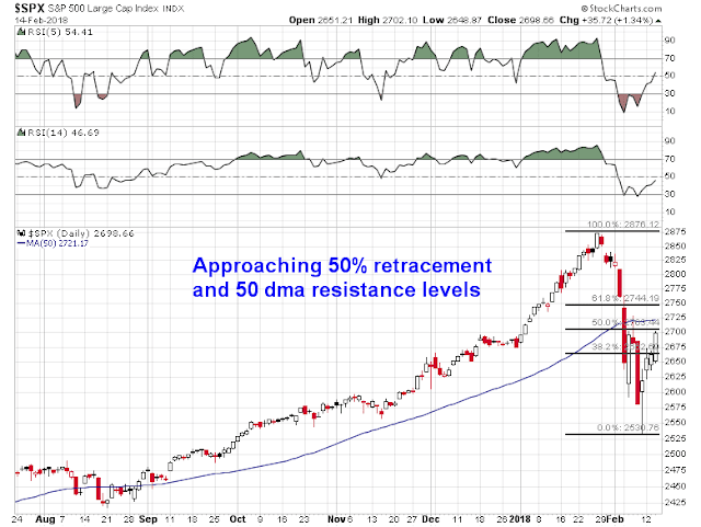Mid-week market update: I can tell that a stock market downdraft is a correction and not the start of a major bear market when the doomsters crawl out of the woodwork after the market has fallen (see Is the ‘short volatility’ blowup Bear Stearns or Lehman Brothers?) and analysis from SentimenTrader shows that their smart and dumb money sentiment indicators are at an extreme. As a frame of reference, SentimenTrader defines each term in the following way: