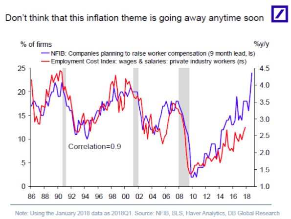 What about the closely watched wage inflation, which is part of the Phillips Curve and a key component of Fed policy? Deutsche Bank pointed out that the small business plans to raise worker compensation leads the Employment Cost Index by about nine months. As the chart below shows, this leading indicator is pointing to rising wage pressure.