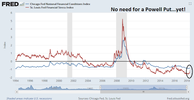 For some perspective, financial conditions are still loose despite the recent market hiccup. There is little necessity for a Powell put, at least for now.