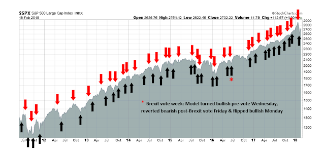 Update schedule: I generally update model readings on my site on weekends and tweet mid-week observations at @humblestudent. Subscribers receive real-time alerts of trading model changes, and a hypothetical trading record of the those email alerts is shown here.