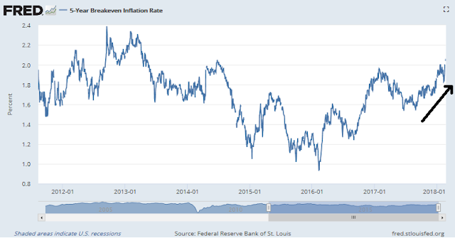 From the market’s perspective, there are a number of anomalous readings on inflation expectations. Sure, the 5-year breakeven rates have been rising steadily, which is reflective of the bond market’s expectations of rising inflation.