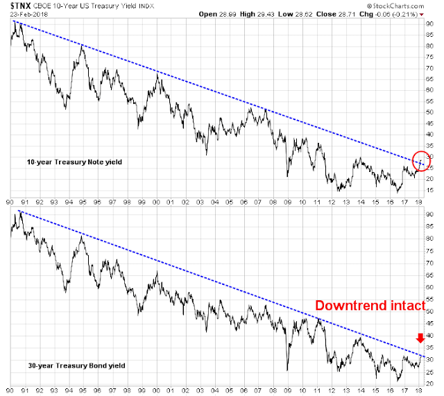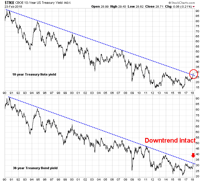 Just as James Bond escaped the perils he faced in many films, bonds may be able to escape their perceived risks. That’s because the market may be focused on the wrong bond. The top panel of the following chart shows the yield 10-year Treasury note, which has violated a trend line that stretches back to 1990, and the yield of the 30-year Treasury, which has not.
