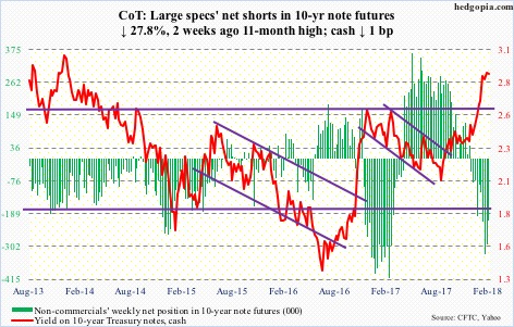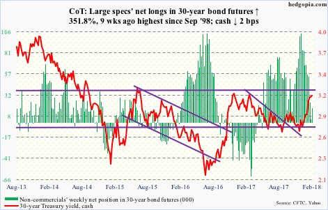 Up until recently, the record short in the 10-year had been offset by a neutral reading in the long Treasury bond, which was a hint that the market was positioned for a flattening of the 30-10 spread. But the latest readings show that large speculators are also near a crowded short position in the T-Bond contract too, and the flattening bets got unwound.