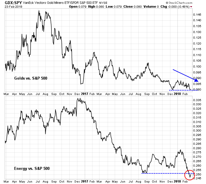 The message from the stock market is totally different. If inflation expectations are rising, then we would expect that the hard asset sectors, which perform well as inflation hedges, to be performing well. As the chart below shows, gold and energy stocks are not performing well relative to the market.