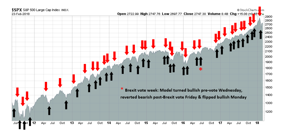 Update schedule: I generally update model readings on my site on weekends and tweet mid-week observations at @humblestudent. Subscribers receive real-time alerts of trading model changes, and a hypothetical trading record of the those email alerts is shown here.