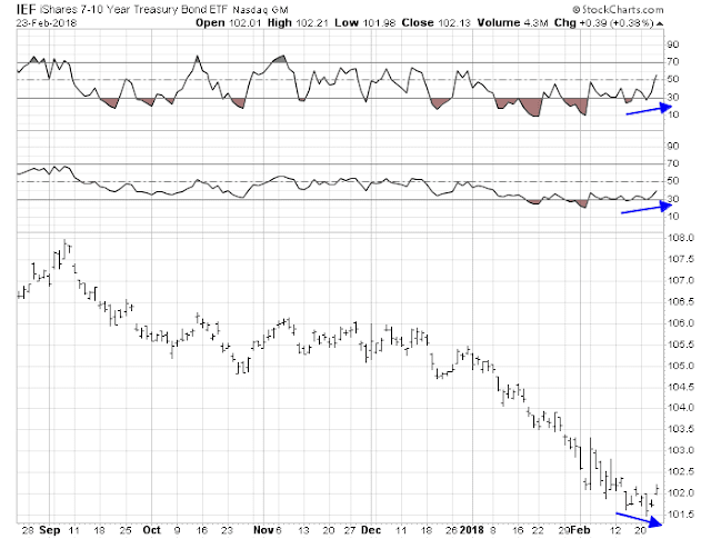 Bond prices are also setting up for a possible rally from a technical perspective. The chart below of the 7-10 year Treasury ETF (IEF) is flashing a clear positive divergence on RSI-5, and a less clear signal on RSI-14.