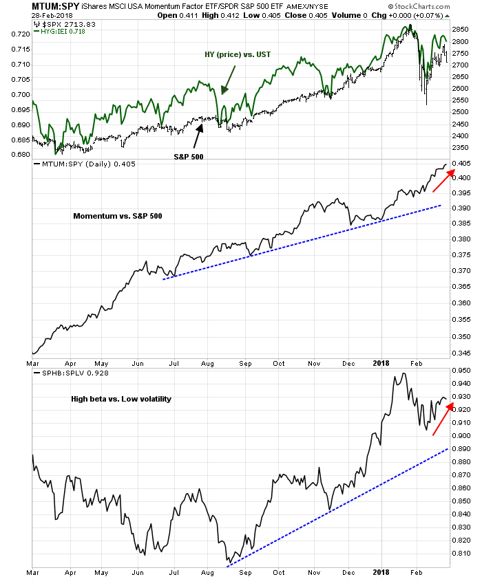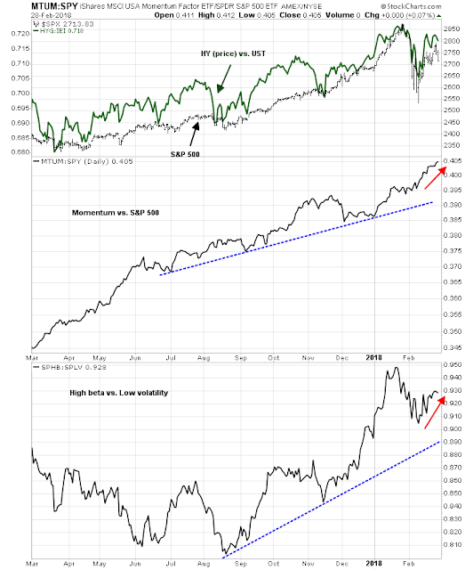 For now, my inner trader remains cautiously bullish, though he is open to the possibility of a minor pullback at these levels. From an intermediate term viewpoint, the “good” animal spirits are reviving. Risk appetite, as measured by junk bond performance, price momentum, and high beta vs. low volatility, remain in strong uptrends.