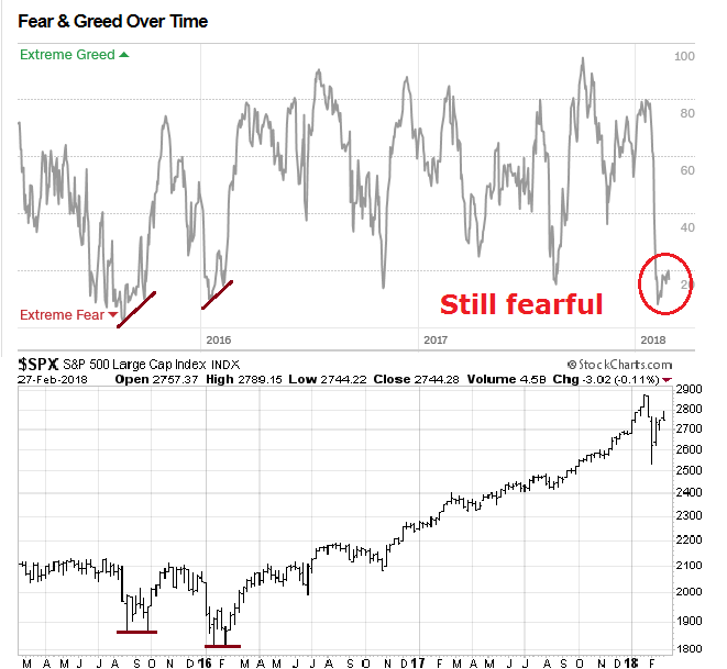 The Fear and Greed Index remains in fear territory at 17. Should stock prices pull back, however, I would be watching for signs of positive divergence that have occurred at past W-shaped bottoms.
